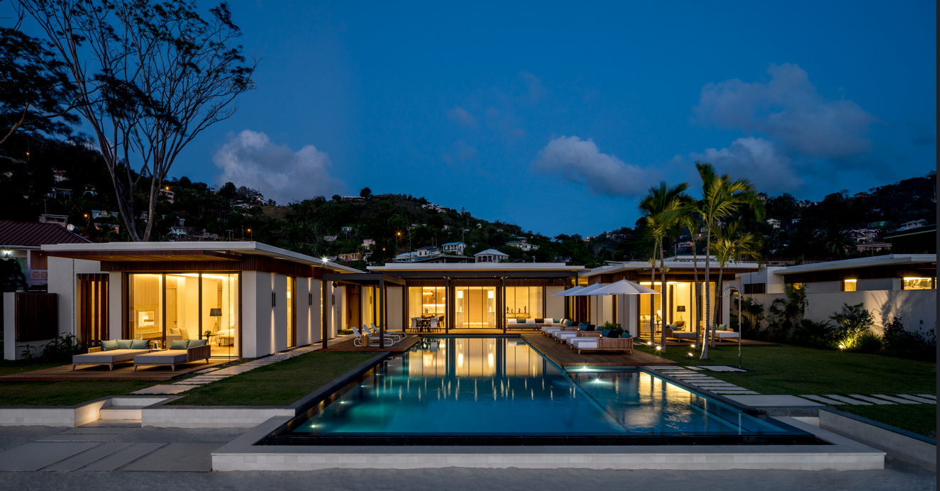The villas feature three to four bedrooms (5,000–6,000 sq ft), with private pools, chef kitchens, and seamless indoor-outdoor flow. Choose between beachfront villas with immediate sand access or hillside villas with panoramic views.